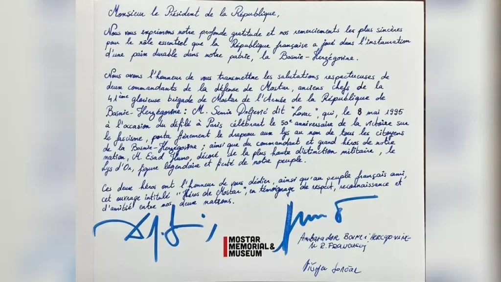 Ambasadorica Bosne i Hercegovine u Republici Francuskoj, Višnja Lončar, prilikom posjete Jelisejskoj palači i susreta sa predsjednikom Republike Francuske Emmanuelom Macronom, uručila mu je knjigu “Heroji Mostara”.