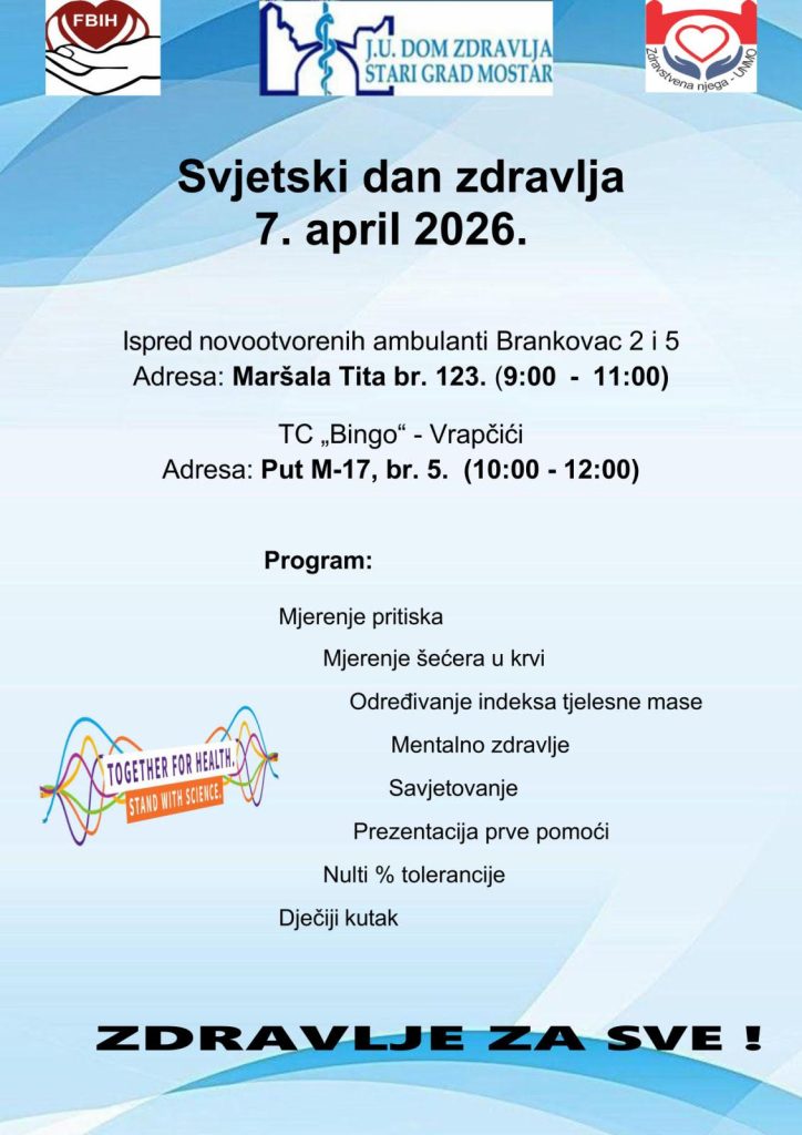 Dom zdravlja Stari grad Mostar zajedno sa studentima Studija Zdravstvena njega Univerziteta “Džemal Bijedić” i Udruženjem med.sestara tehničara FBiH, povodom 7. aprila Svjetskog dana zdravlja, sutra na dvije lokacije organizuje zdravstvenu akciju pod motom “Jedan dolazak može promijeniti sve”.