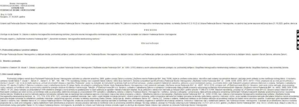 Ustavni sud Federacije BiH je na sjednici bez javne rasprave održanoj 21. oktobra 2025. godine donio presudu kojom je utvrdio da član 74. Zakona o vodama Hercegovačko-neretvanskog kantona “nije u skladu s Ustavom Federacije BiH”.