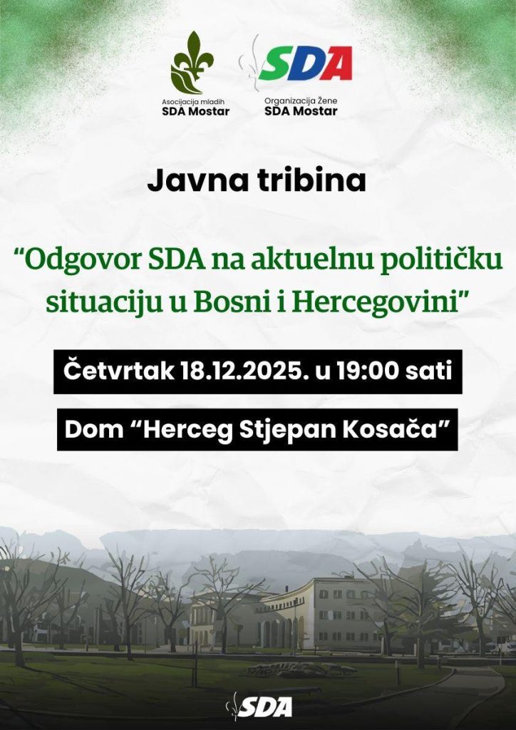 Asocijacija mladih SDA Mostar i Gradska organizacija Žene SDA Mostar najavile su održavanje javne tribine pod nazivom „Odgovor SDA na aktuelnu političku situaciju u Bosni i Hercegovini“. Događaj je planiran za četvrtak, 18. decembra, u kulturnom domu „Herceg Stjepan Kosača“, s početkom u 19 sati.