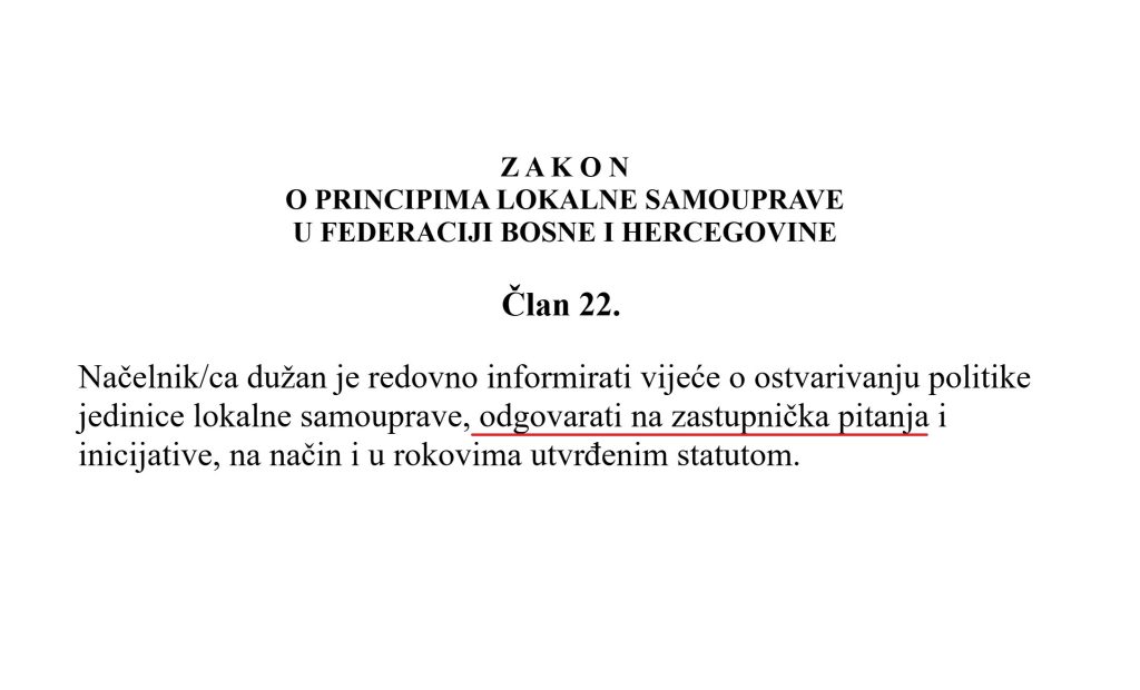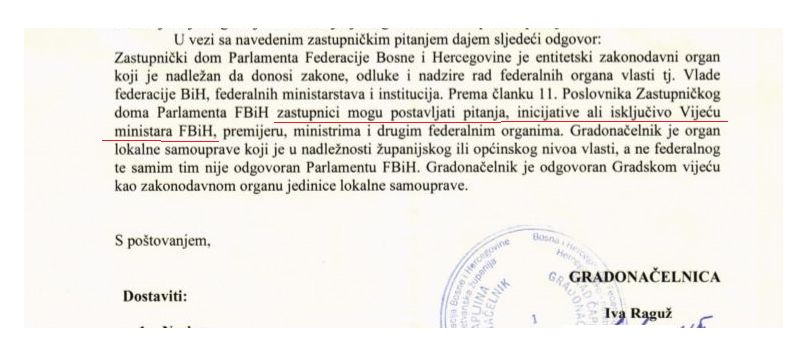 “Iako zakoni jasno propisuju obavezu odgovaranja na pitanja i inicijative koje dolaze od zastupnika, gradonačelnica Čapljine Iva Raguž (HDZ) te odredbe svjesno zanemaruje. Prema članu 123 Statuta Grada Čapljine, ali i relevantnim zakonima Federacije BiH, poput Člana 22 Zakona o principima lokalne samouprave, lokalni organi vlasti dužni su sarađivati i odgovarati na pitanja zastupnika – što u ovom slučaju izostaje.