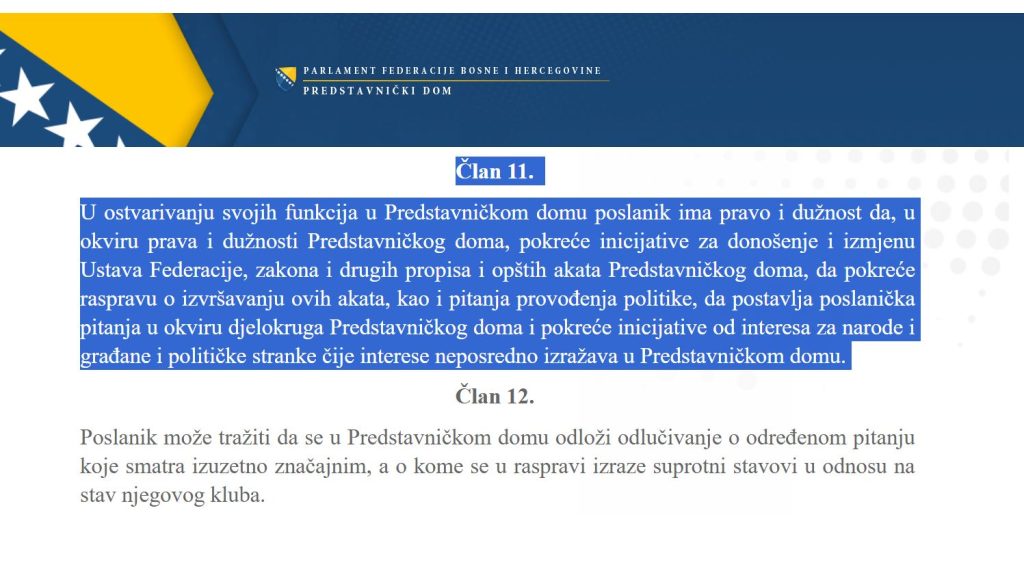 Inače, Član 11 Predstavničkog doma, na koji se dotična poziva, doslovno glasi: “U ostvarivanju svojih funkcija u Predstavničkom domu poslanik ima pravo i dužnost da, u okviru prava i dužnosti Predstavničkog doma, pokreće inicijative za donošenje i izmjenu Ustava Federacije, zakona i drugih propisa i opštih akata Predstavničkog doma, da pokreće raspravu o izvršavanju ovih akata, kao i pitanja provođenja politike, da postavlja poslanička pitanja u okviru djelokruga Predstavničkog doma i pokreće inicijative od interesa za narode i građane i političke stranke čije interese neposredno izražava u Predstavničkom domu. “