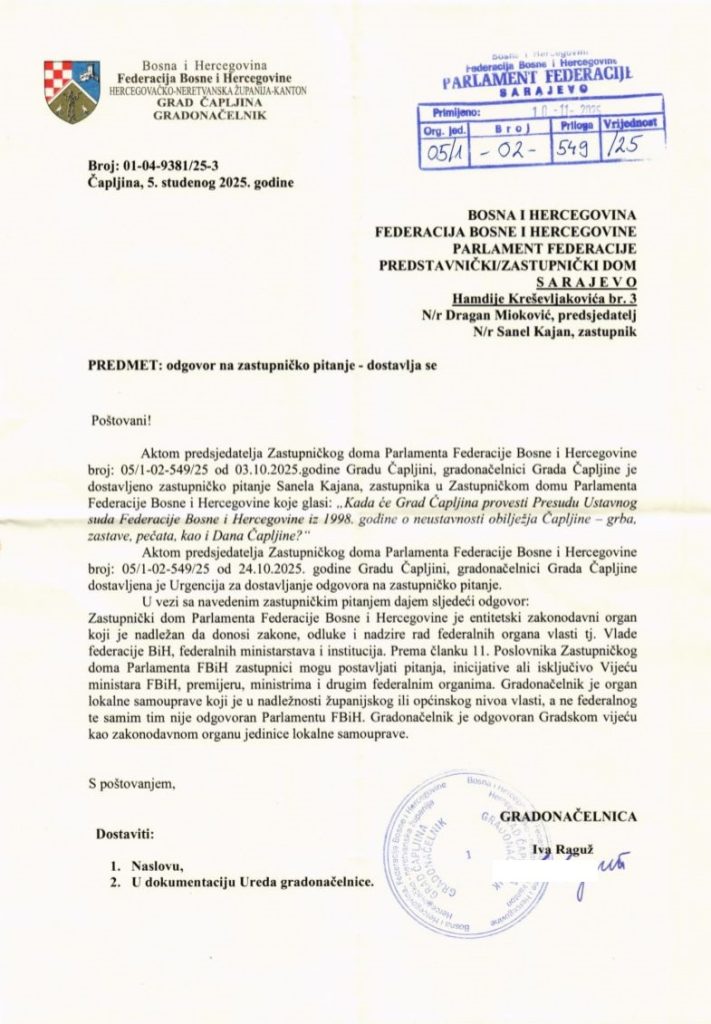 Zastupnik Demokratske fronte u Predstavničkom domu Parlamenta Federacije BiH, Sanel Kajan, upozorio je da gradonačelnica Čapljine Iva Raguž (HDZ) svjesno krši zakonske obaveze jer ne odgovara na zastupnička pitanja i inicijative. Njegovu objavu sa društvenih mreža prenosimo u cijelosti.