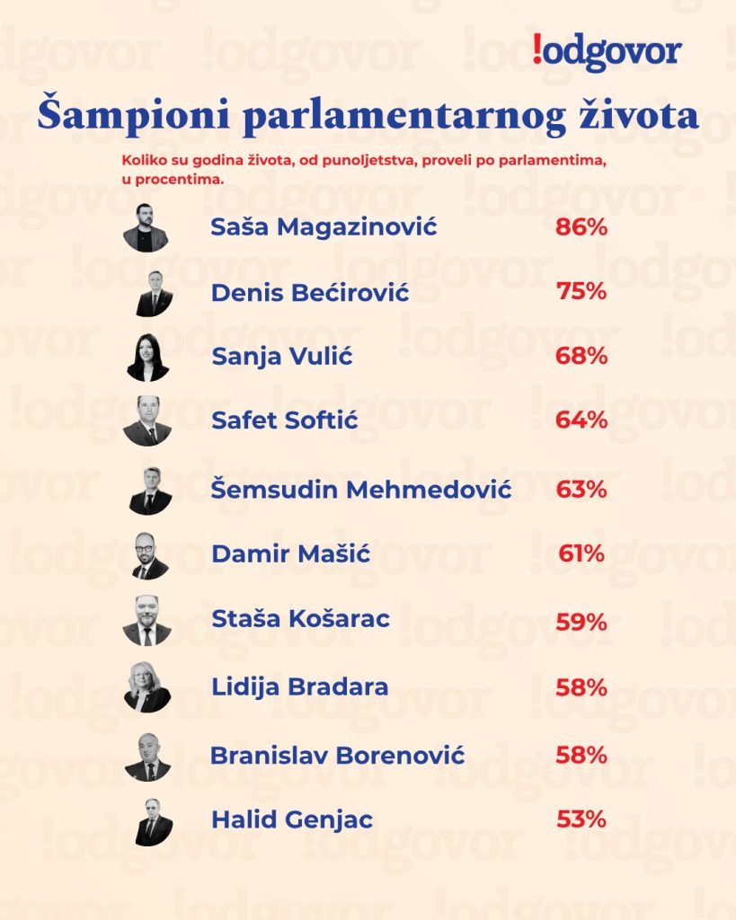 Tek sada dolazi Halid Genjac. Sve i kada bismo računali puki zbroj godina u Parlamentu, Genjac ipak nije „šampion“. Iznad njegovih 26 parlamentarnih godina su Šemsudin Mehmedović (29) i Safet Softić (27), ali je odmah iza njega Saša Magazinović – 25 godina. S tim što je Genjac od Magazinovića stariji 20 godina.