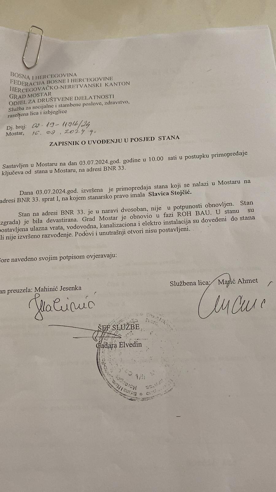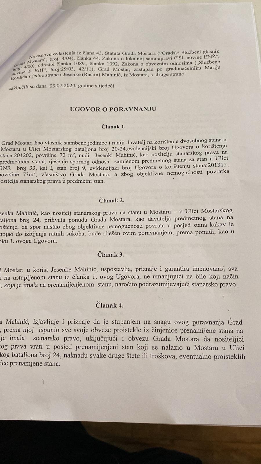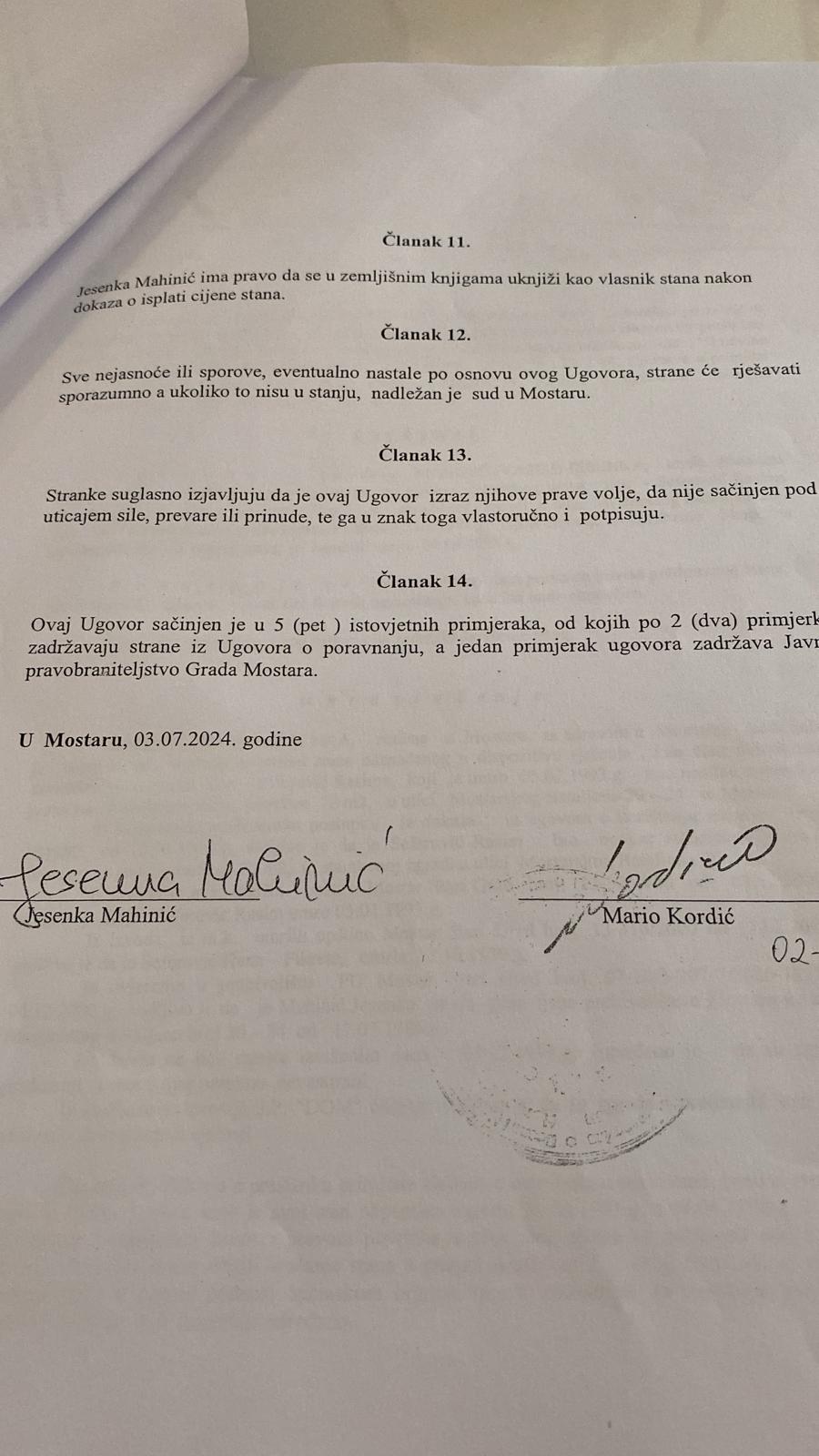 Gradonačelnik Mostara, Mario Kordić, 3. jula 2024. godine zaključio je Ugovor o prodaji stana u vlasništvu Grada Mostara sa Jesenkom Mahinić, šeficom Službe za inspekcijske poslove Grada Mostara.