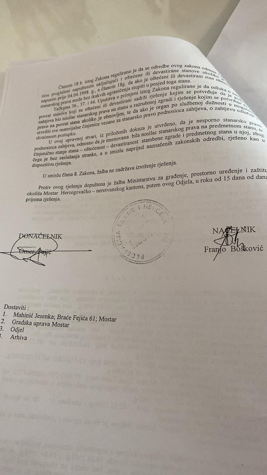 Osnov za ovakvu odluku, gradonačelnik Kordić je našao u činjenici da je otac od Jesenke Mahinić bio nosilac stanarskog prava nad stanom na adresi Mostarskog bataljona od 20-24., površine 72 kvadratna metra.