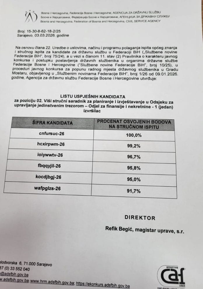 Naime, kako zakon i nalaže, Agencija za državnu službu je poslala Gradu Mostaru listu uspješnih kandidata nakon provedenog konkursa.