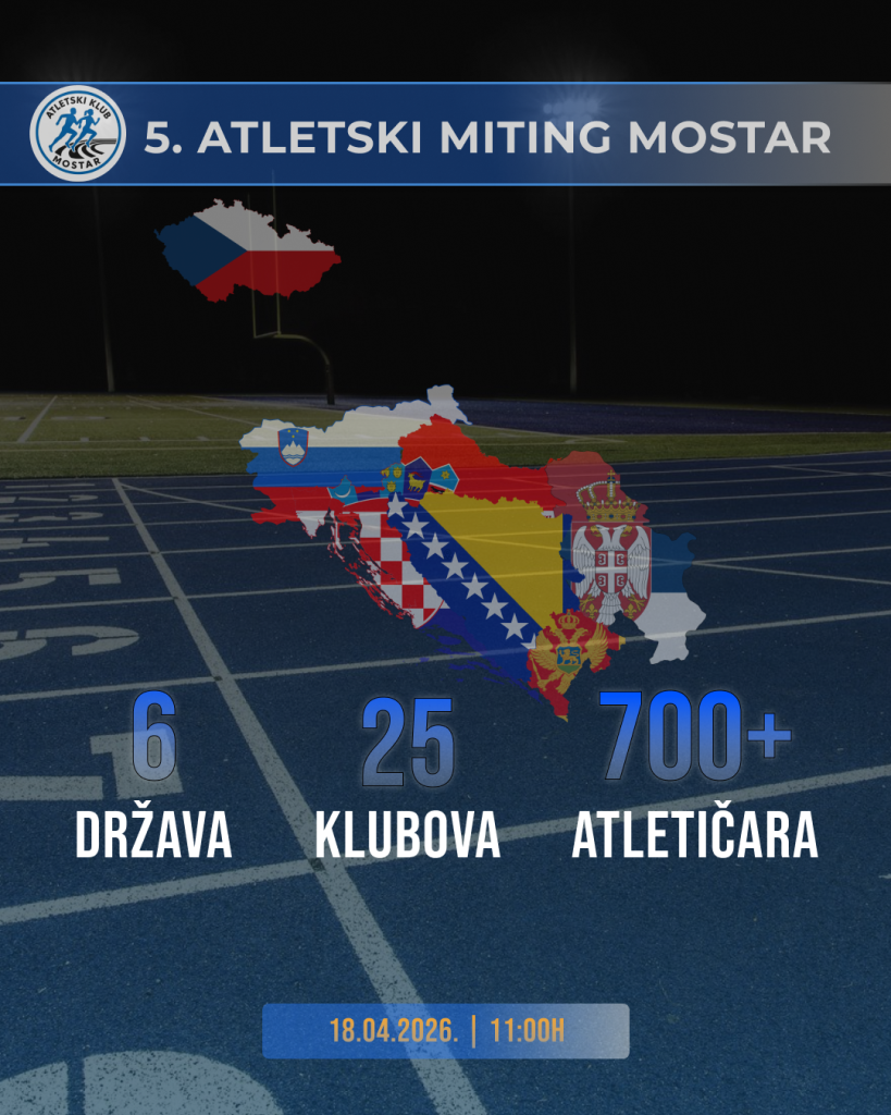 Grad Mostar će 18. aprila 2026. godine biti domaćin petog, jubilarnog izdanja Atletskog mitinga Mostar, sportskog događaja koji iz godine u godinu okuplja sve veći broj vrhunskih atletičara, mladih talenata i ljubitelja atletike iz Bosne i Hercegovine i regiona.