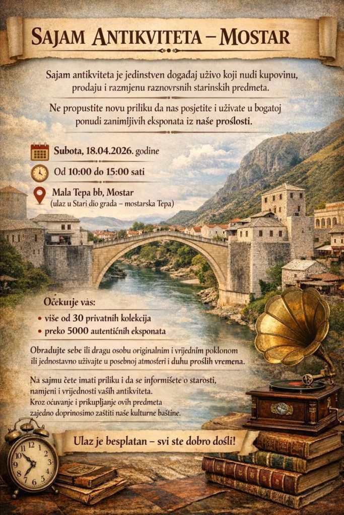 U organizaciji JP „Tržnice-pijace“ Mostar, u saradnji s vlasnicima suvenira i kolekcionarima antikviteta, u Mostaru će u subotu 18. aprila 2026. godine biti održan 1. Međunarodni sajam antikviteta. Manifestacija će se održati na lokalitetu mostarske Tepe (Mala Tepa bb), u terminu od 10 do 15 sati.
