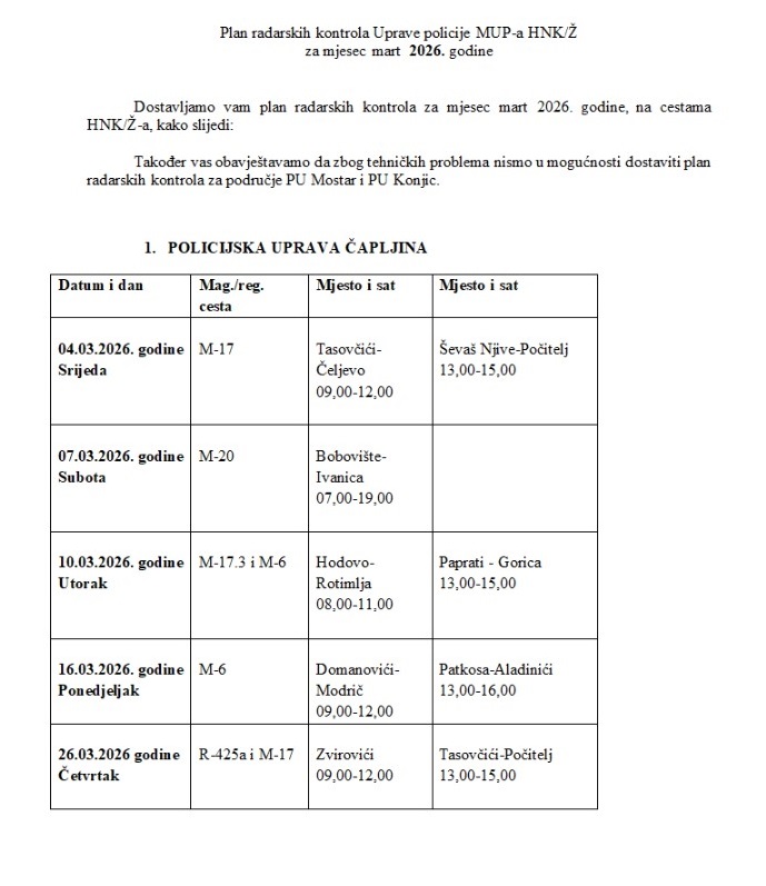 Ministarstvo unutrašnjih poslova (MUP) Hercegovačko -neretvanskog kantona (HNK) objavilo je plan radarskih kontrola za mjesec mart: