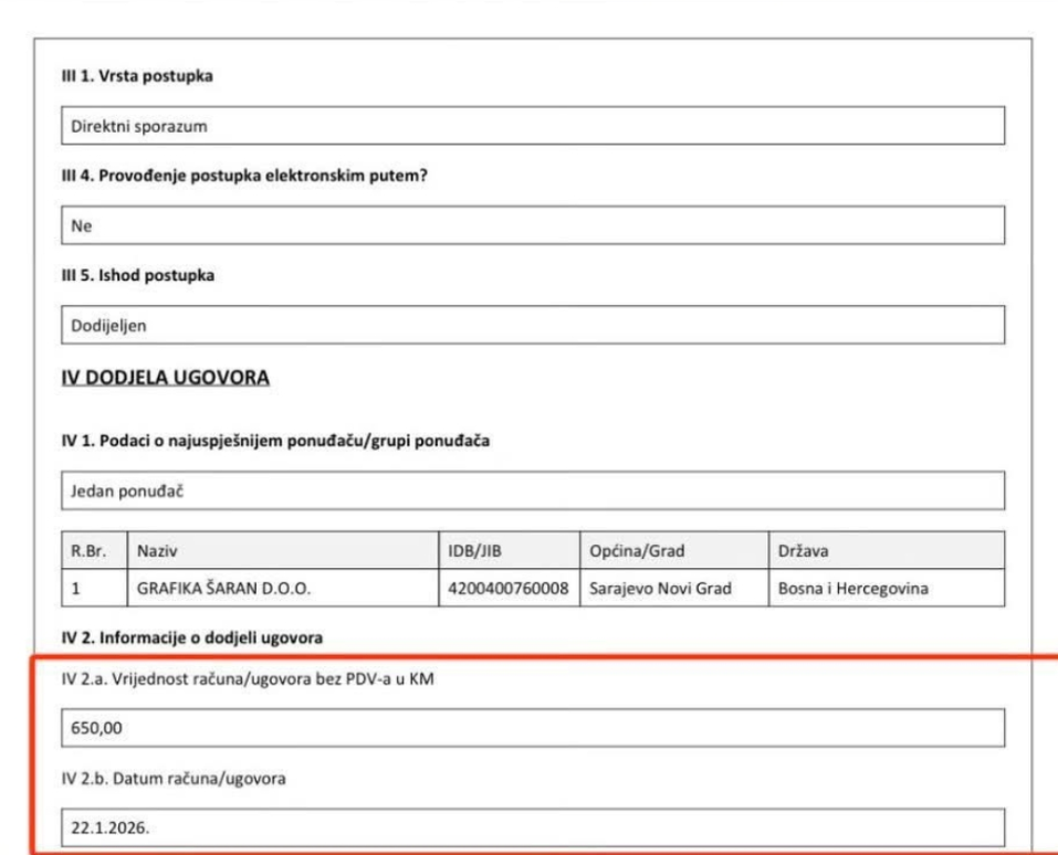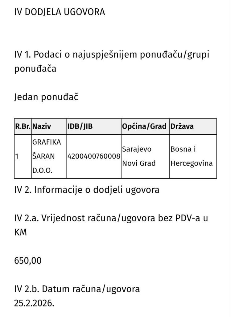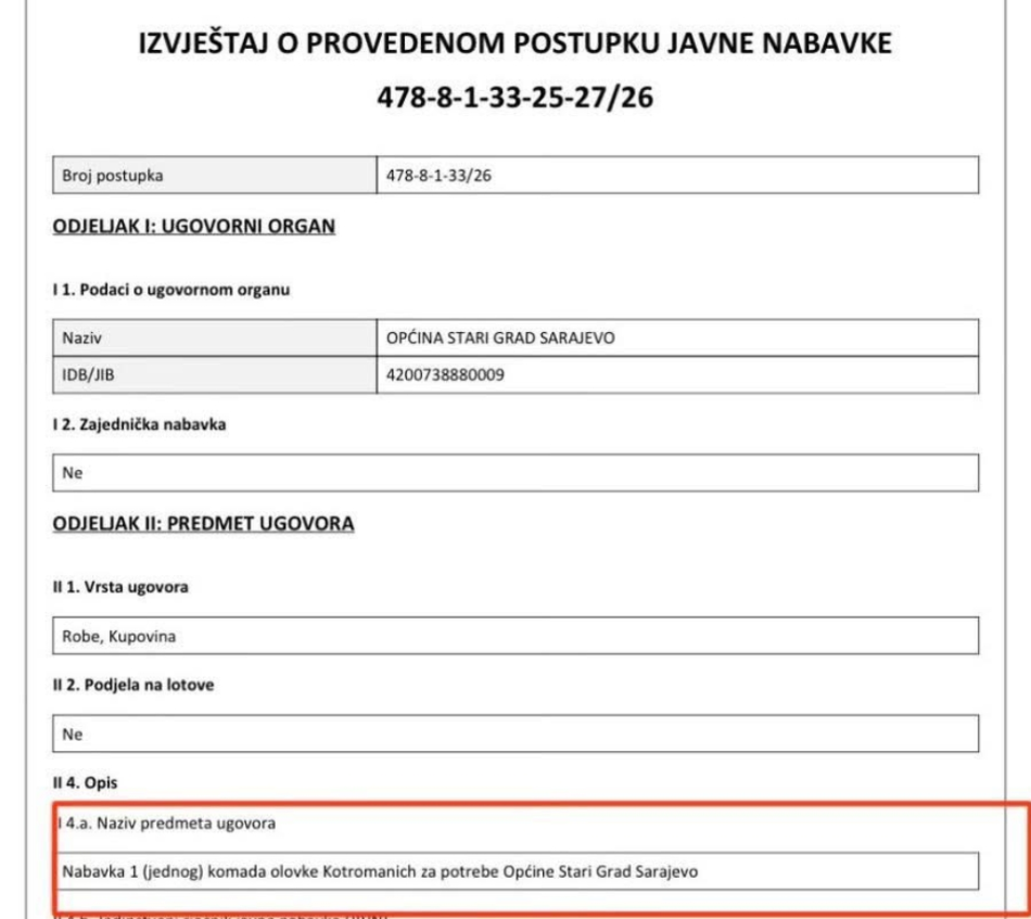 Ugovor o javnoj nabavci zaključen je 22. januara 2026. godine između Općine Stari Grad, na čijem je čelu Irfan Čengić (SDP), i kompanije Grafika Šaran d.o.o.. Kao predmet nabavke navodi se jedno naliv-pero domaćeg brenda Kotromanich.