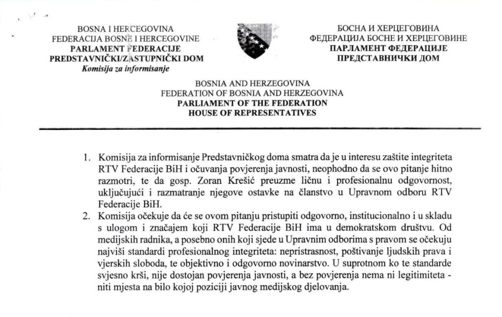 U Parlament Federacije Bosne i Hercegovine danas je zvanično podnesena inicijativa za razrješenje Zorana Krešića sa pozicije člana Upravnog odbora Radiotelevizija Federacije Bosne i Hercegovine.