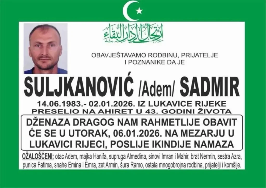 Kako je potvrđeno, riječ je o Sadmiru Suljkanoviću (43) iz Lukavica Rijeke, općina Doboj Istok. On je ukopan jučer na mjesnom mezarju u ovom rodnom mjestu.