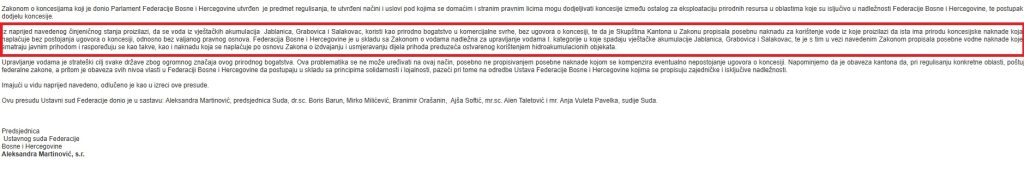 Sud naglašava da je Zakonom o koncesijama koji je donio Parlament Federacije Bosne i Hercegovine utvrđen predmet regulisanja, te načini i uslovi pod kojima se domaćim i stranim pravnim licima mogu dodjeljivati koncesije za eksploataciju prirodnih resursa u oblastima koje su isljučivo u nadležnosti Federacije.