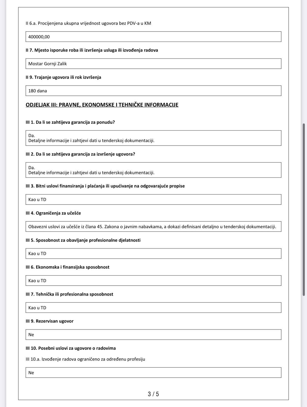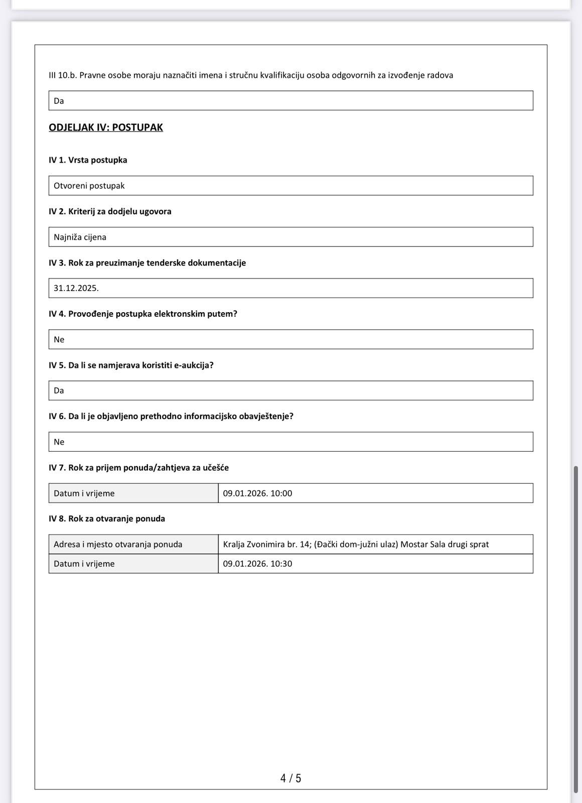 Otvaranje pristiglih ponuda planirano je za 9. januar 2026. godine, a očekuje se da radovi započnu tokom iste godine, bez dodatnih administrativnih zastoja. Predviđeni rok za izvođenje radova iznosi 180 dana od dana potpisivanja ugovora s izvođačem.