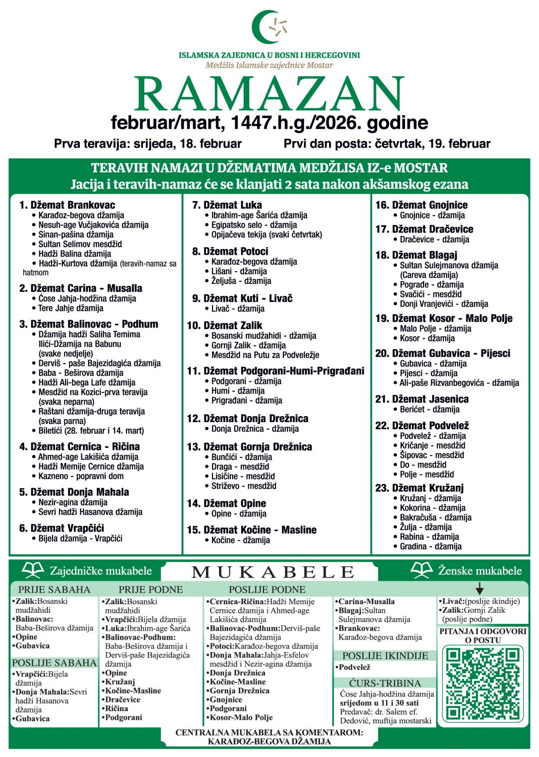 Po Takvimu Rijaseta Islamske zajednice mjesec ramazan nastupa s akšam-namazom u srijedu, 18. februara 2026. godine. Prvi teravih-namaz klanjat će se po takvimu, a preostale dva sahata nakon iftara, saopćeno je iz Medžlisa Mostar.