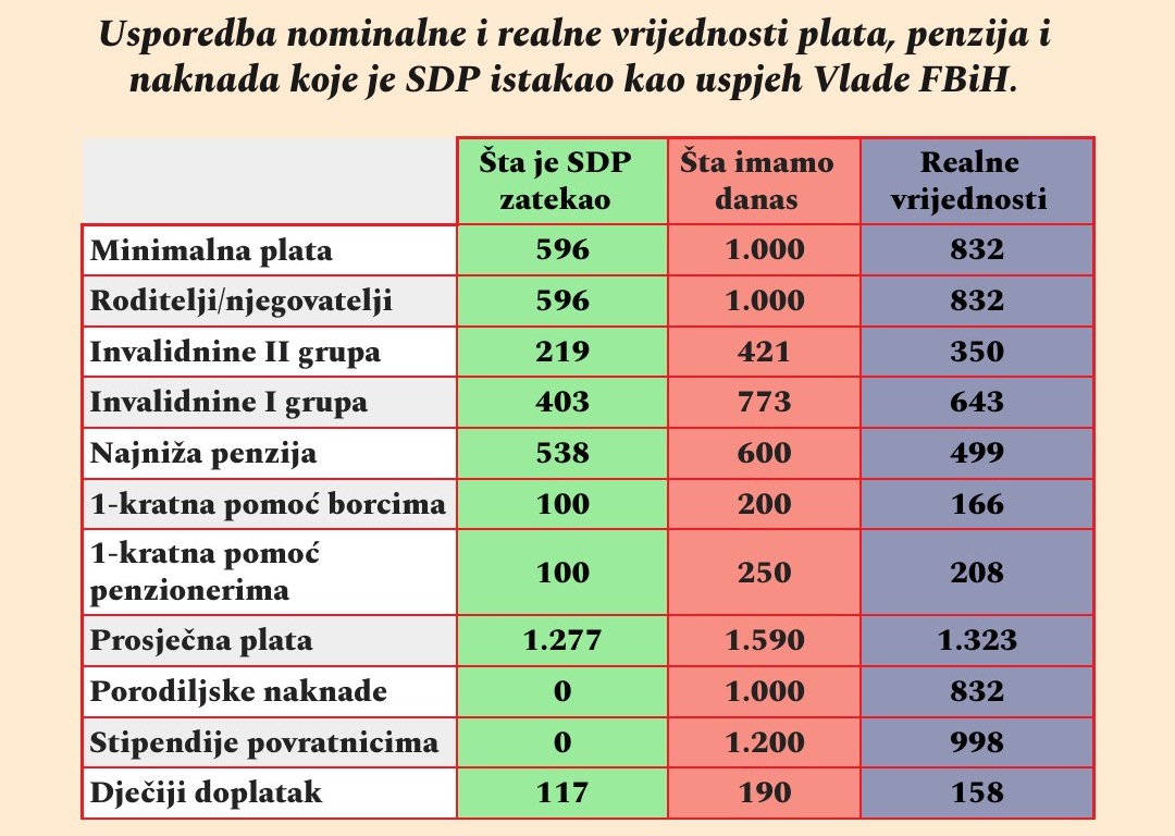 Jednostavno: SDP je napravio usporedbu određenih socijalnih davanja i naknada te nekih ekonomskih parametara. Na lijevoj, zelenoj strani je SDA, sa slikom Fadila Novalića u pozadini – dakle, ono što je SDP zatekao preuzimajući federalnu vlast 2022. Na desnoj, crvenoj strani je SDP, sa slikom Nermina Nikšića u pozadini – dakle, ono što imamo sada, odnosno što SDP tvrdi da su oni postigli.