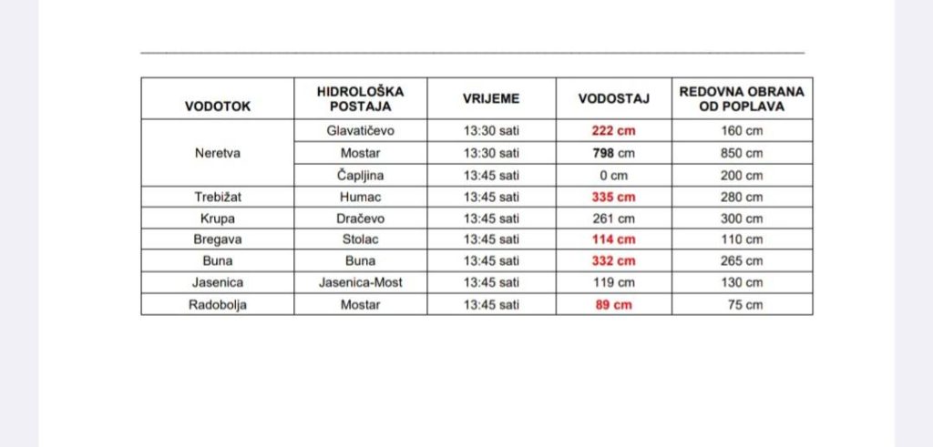 Prema informacijama iz Operativnog centra Čapljina, u toku je obilazak nasipa i kontinuirano praćenje vodostaja rijeka. Vodostaj je u blagom padu u odnosu na prethodni dan.