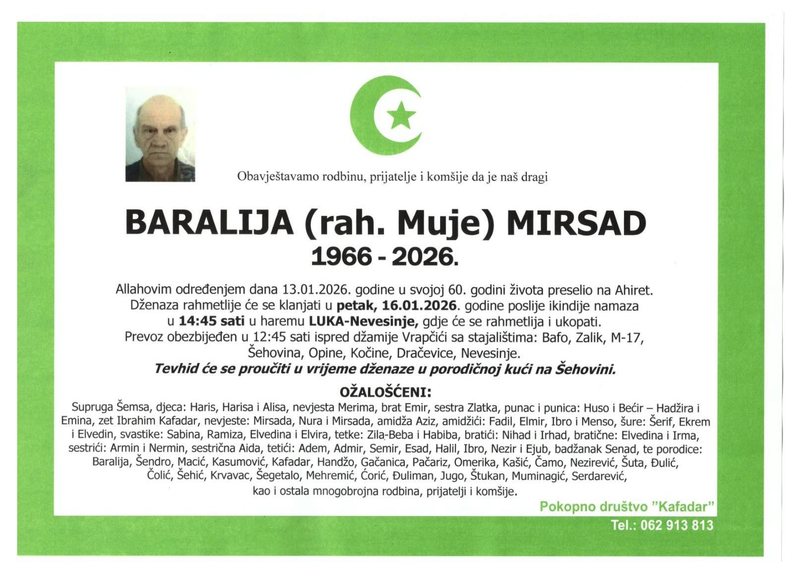 Dženaza-namaz Mirsadu Baraliji, građevinskom radniku koji je tragično stradao tokom izvođenja radova u Mostaru, klanjat će se u petak, 16. januara 2026. godine, nakon ikindije-namaza u 14:45 sati u haremu Luka–Nevesinje, gdje će se obaviti i ukop.
