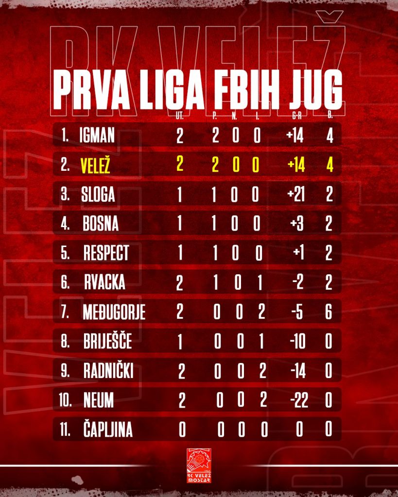 Tokom vikenda, od petka do nedjelje, odigrane su sve utakmice drugog kola, a na vrhu tabele trenutno su dvije ekipe – Velež i Igman – koje dijele prvo mjesto sa identičnim učinkom i gol-razlikom, potvrđeno je iz RK Velež.