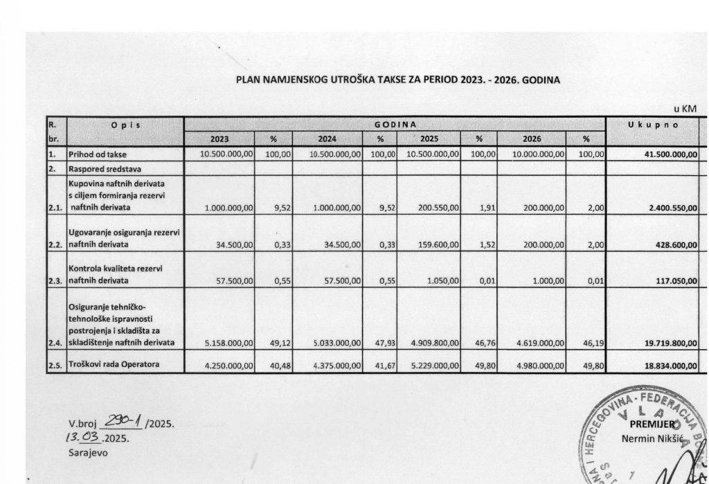 Međutim, prema objavljenoj raspodjeli sredstava, najveći dio novca ne ide na kupovinu same nafte. U posmatranom periodu za administraciju, rad operatera i skladištenje planirano je ukupno oko 38,5 miliona KM. Nasuprot tome, za stvarnu kupovinu nafte i naftnih derivata predviđeno je svega oko 2,4 miliona KM, što iznosi približno 5,8 posto ukupnih sredstava.